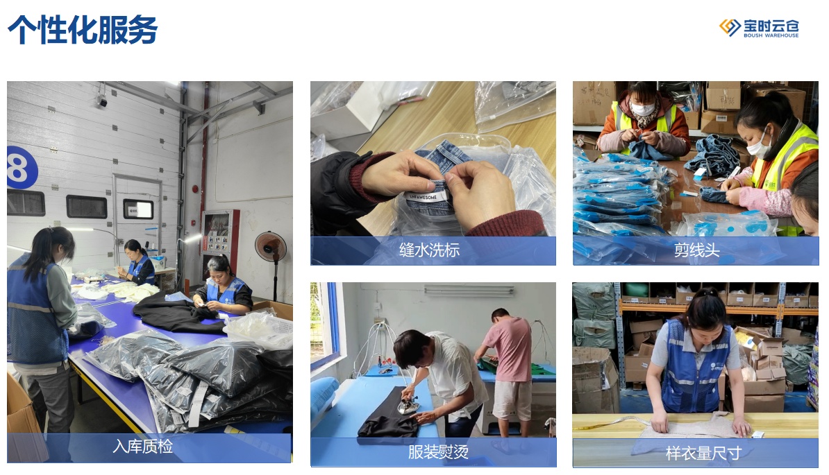 在倉配服務(wù)方面,除了常規(guī)的倉儲管理、分揀打包、快遞物流、售后服務(wù)外,寶時云倉還提供了一系列增值服務(wù),如服裝質(zhì)檢、大燙/掛燙、掛吊牌、組套、貼標(biāo)、縫領(lǐng)標(biāo)、樣衣量尺寸、掛卸防盜扣、包裝定制等等,以滿足服裝品牌的個性化需求。